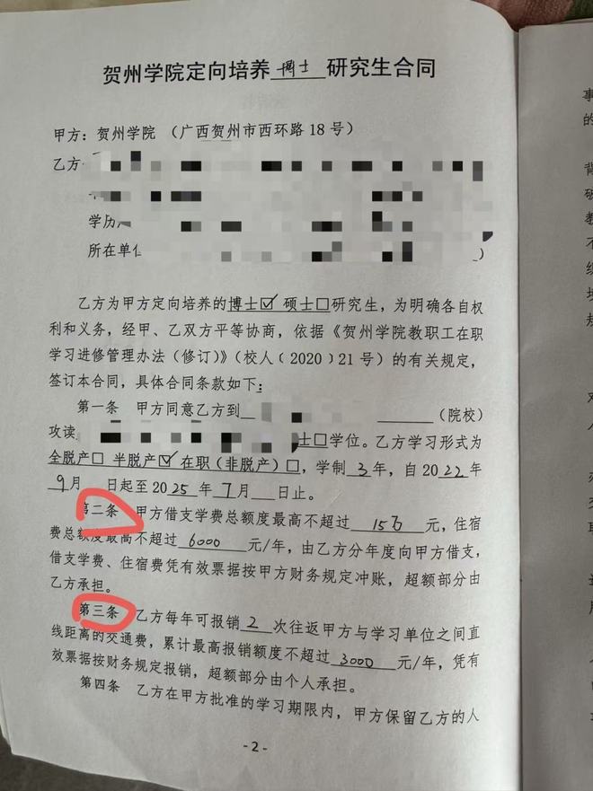 通过自己的努力,夏荷申请到了澳门一所大学的博士。2022年6月,夏荷和贺州学院签订了《贺州学院定向培养博士研究生合同》,该合同显示,夏荷的学习模式为在职,学制为3年,即2022年9月至2025年7月;贺州学院向夏荷借支学费总额最高不超过15万元,住宿费总额度不超过6000元一年;夏荷每年可报销2次往返贺州学院与学习单位之间直线距离的交通费,累计最高报销额度不超过3000元一年。在夏荷学习期间,贺州学院保留夏荷的人事档案、社会保险、工资关系等,并正常参加贺州学院专业技术资格的晋升竞聘。