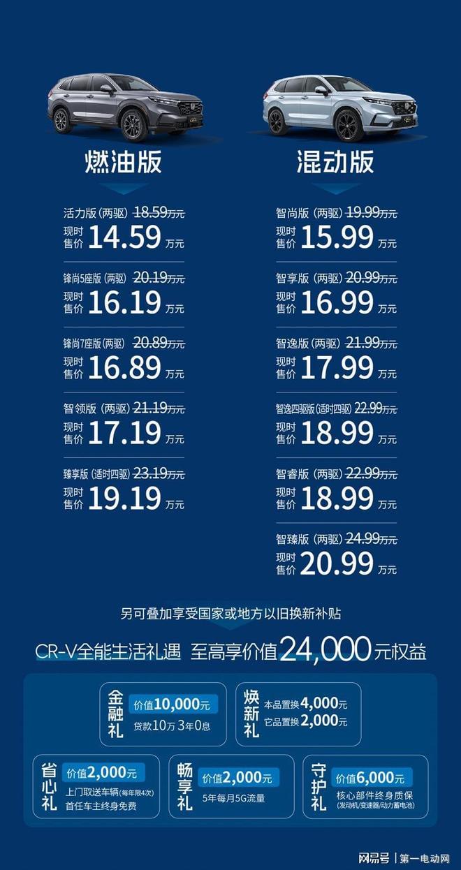 值得一提的是,为了让每位用户都能轻松拥有高品质出行体验,东风本田CR-V全球30年荣耀款现时售价14.59万元起,同时新CR-V还准备了价值高达2.4万元的全能生活礼遇,包括:贷款10万3年免息、厂家置换补贴至高4千元、核心部件终身质保以及可叠加享受国家或地方以旧换新补贴等多重福利。