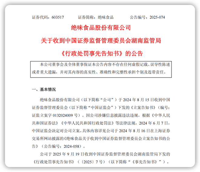 蓝鲸新闻9月23日讯(记者 代紫庭)2025年9月19日,绝味食品(603517.SH)公告收到湖南证监局下发的《行政处罚事先告知书》,因信息披露违规行为,公司及高管被处以合计850万元罚款。