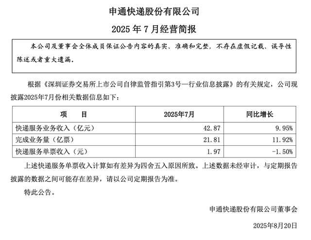最近,申通快递披露了2025年8月经营简报,期内,公司快递服务业务收入为44.34亿元,同比增长14.47%;完成业务量21.47亿票,同比增长10.92%。