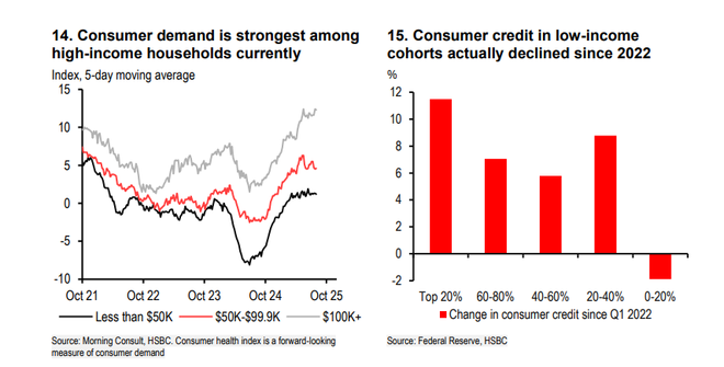 鉴于收入最高的10%家庭贡献了约50%的总体消费,他们的强劲支出足以支撑整体宏观数据,而这正是市场参与者最为关注的。因此,低收入群体的压力虽然真实存在,但其对整体经济的拖累作用相对有限。