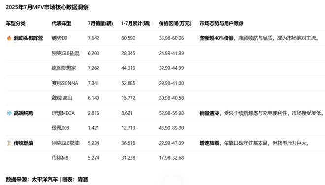 销量数据就是最直观的战况,以7月为例,现在整个MPV格局在加速洗牌。销量前五名清一色都是新能源车,腾势D9(7,642辆)、赛那混动(7,341辆)、岚图梦想家(7,262辆)、GL8插混(6,203辆)和魏牌高山(6,149辆)这五款加起来单月就卖了超过3.5万辆,占了整个市场超过四成的份额,基本坐实了“混动主导+高端化”的大趋势。