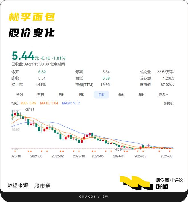 但值得注意的是,截至9月23日收盘,桃李面包的市值已回落至87.02亿元,较最高点蒸发超330亿元。