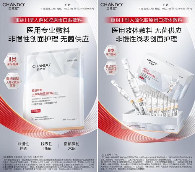 不久前,自然堂宣布推出了两款械字号新品——重组Ⅲ型人源化胶原蛋白贴敷料与液体敷料。