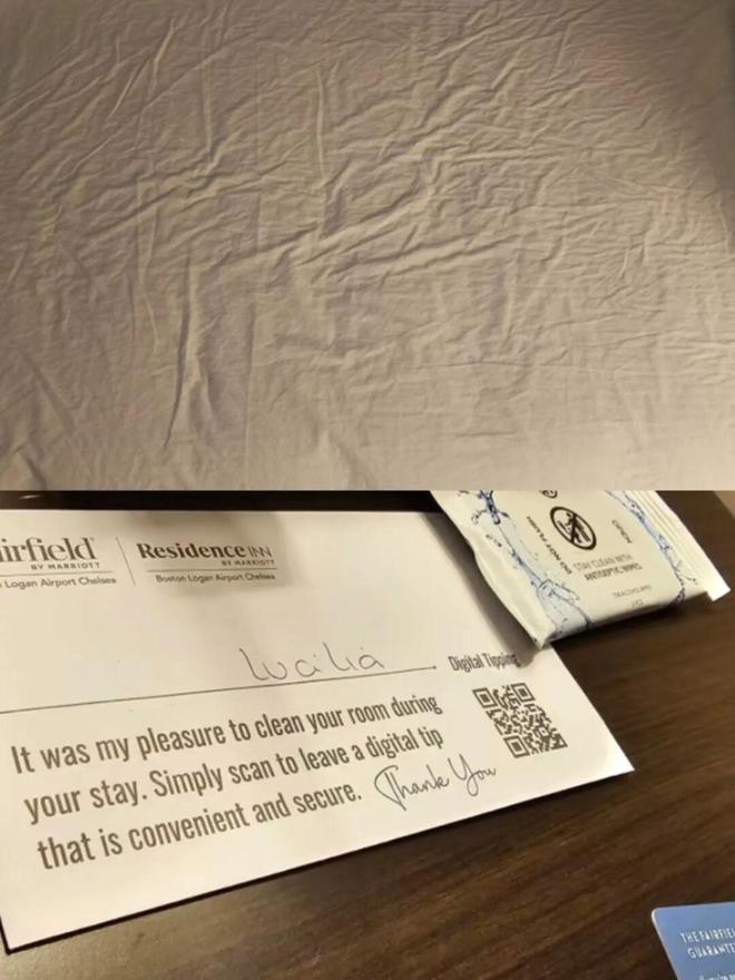 对此,小黑告诉潘哥:“酒店不仅让我自己换床单,房间的床头居然还有一张纸,让你扫码给清洁人员小费,简直离谱到家了。”