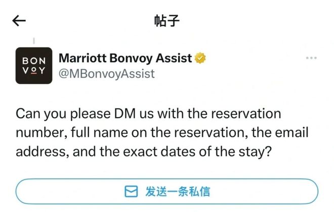 为了追回自己的巨款,山竹后续在X App上,@了Marriott Assist(万豪助手),私信给对方相关信息,并将诉求递交给酒店。