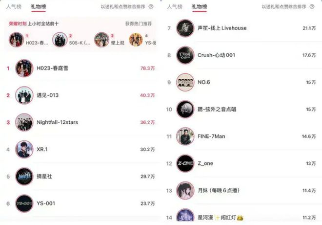 从最新榜单上也可以发现这一趋势,在小红书礼物榜前十四名中,光男团直播间就有十名,其余有三个语音直播间和一个游戏直播间。