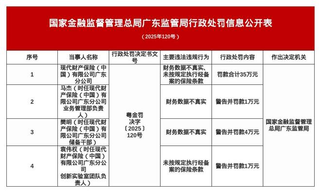 现代财险广东分公司遭罚35万,责任人同步受罚6万
