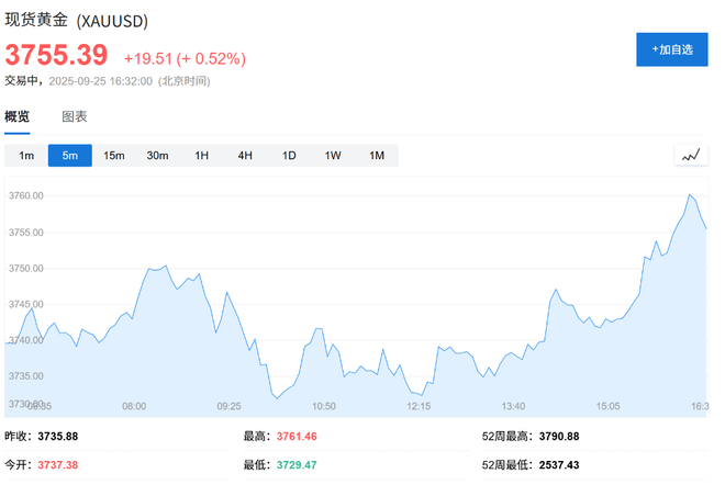 - 现货黄金涨0.5%,报3755.94美元/盎司。