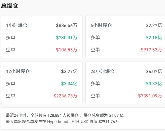 Coinglass显示,近24小时全球共有近13万人被爆仓,爆仓总金额超4亿美元