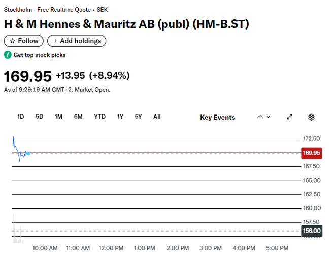 财报公布后,H&M欧股大涨超10%,现涨幅有所回落。