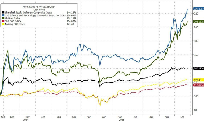 过去一年,中国股市的表现远超全球主要市场。A股总市值首次突破100万亿元,增幅达45%。上证综指从2700点水平飙升至3900点,而以科技股为主的科创50指数和创业板指数更是分别录得了115%和110%的惊人涨幅,同期标普500指数和纳斯达克指数的回报率则分别为16%和24%。