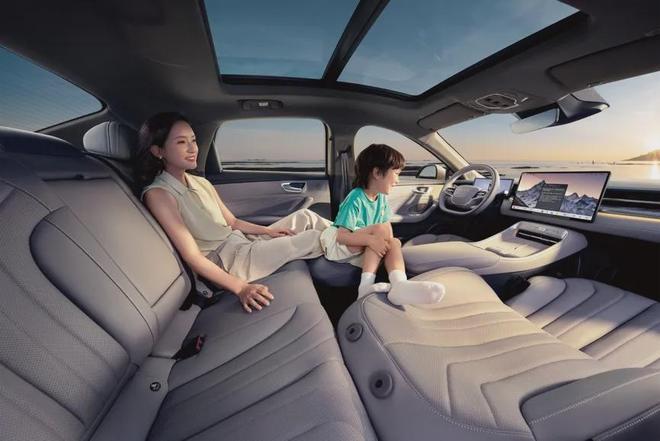 在荣威M7 DMH出现之前,没有人会相信10万级的家用车上能出现“全景沙发躺椅”这个功能。这一设计源自荣威对用户使用场景的精准洞察。副驾座椅向前翻折后化身后排专属超长腿托,纯平空间瞬间变身移动休憩区,小孩在后排休息,宝妈能够放平双腿,实时照看更舒适,又能一同观看中控屏视频,打破前后排的沟通隔阂。