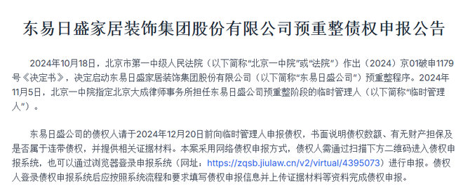 值得一提的是,家居新范式打开东易日盛的官网,跳出来的是预重整债权申报的公告。2024年10月,北京第一中级人民法院决定启动东易日盛的预重整程序,指定北京大成律师事务所担任其重整阶段的临时管理人。