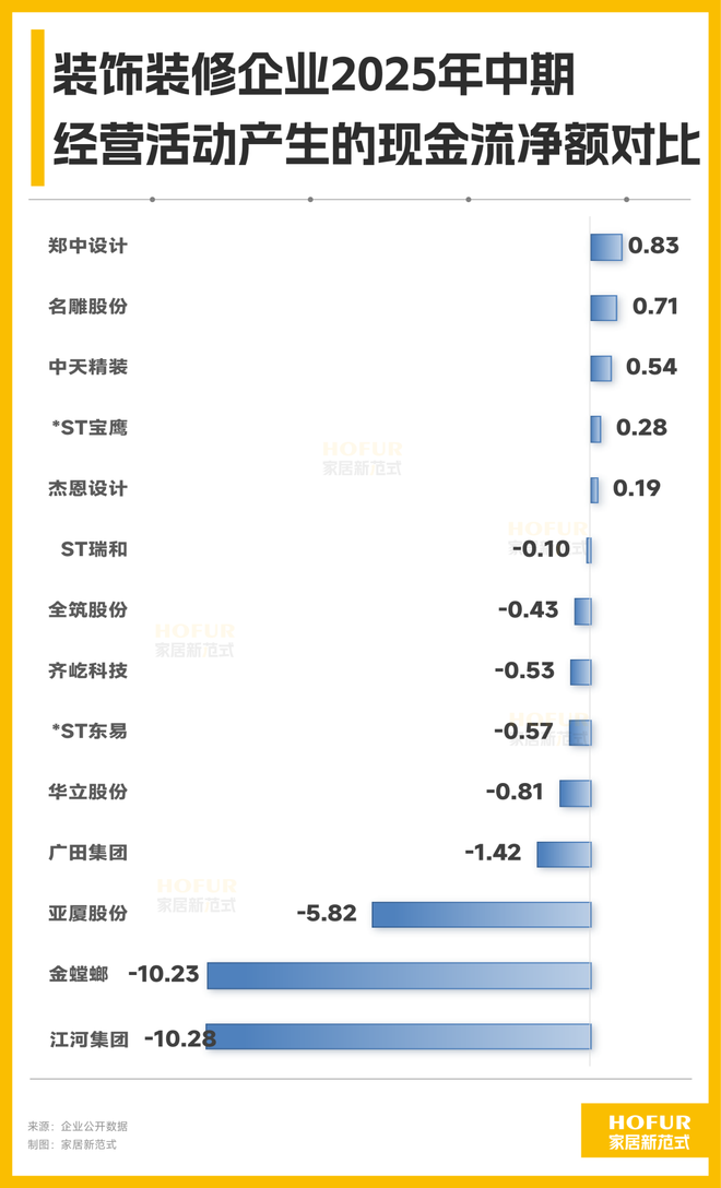 具体来看,2025年上半年,金螳螂、江河集团和亚厦股份等经营活动产生的现金流金额分别为-10.23亿元、-10.28亿元和-5.82亿元,显著低于其他同行企业。