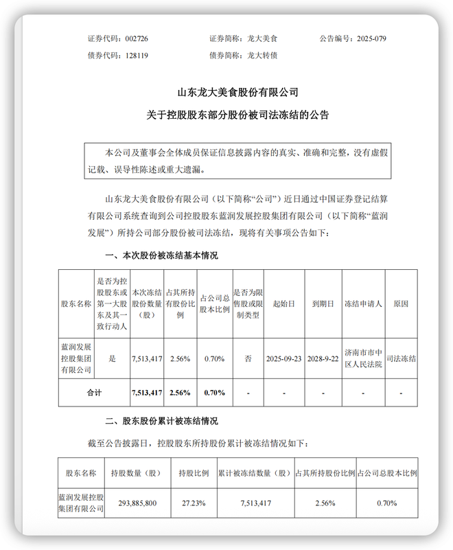 蓝鲸新闻9月26日讯(记者 代紫庭)9月26日,龙大美食(002726.SZ)发布公告称,公司控股股东蓝润发展控股集团有限公司(以下简称"蓝润发展")所持有的公司部分股份被司法冻结。本次冻结股份数量为751.34万股,占蓝润发展所持股份的2.56%,占公司总股本的0.70%。