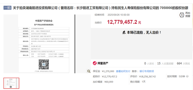 蓝鲸新闻9月26日讯(记者 石雨)今日10时,阿里司法拍卖平台上,民生人寿保险股份有限公司(下称"民生人寿")705万股权份额(占比0.12%)完成拍卖,该笔股权由湖南前进投资有限公司(下称"湖南前进")持有,股权起拍价1277.95万元,因无人报名流拍。