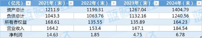 从近年来民生人寿的成绩单来看,2021年以来,其资产与所有者权益逐年上升,2024年末资产总计1404.79亿元,所有者权益164.23亿元;营收与利润方面,2022年有所波动,但此后逐年上行,2024年末营业收入184.54亿元,同比增长10%,净利润6.78亿元,同比增幅近43%。