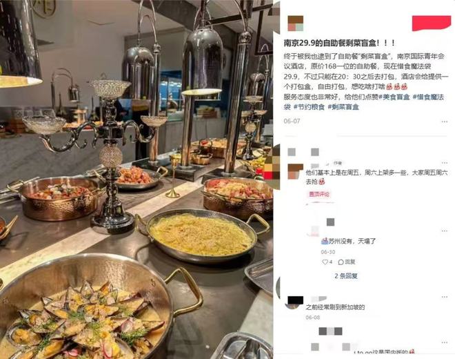 在“剩菜盲盒”的江湖里,永远不缺让人羡慕的“天选之子”。南京网友晒出南京国际青年会议酒29.9元的自助餐剩菜盲盒,原价168元一位的自助餐,并且有“打包自由”权。