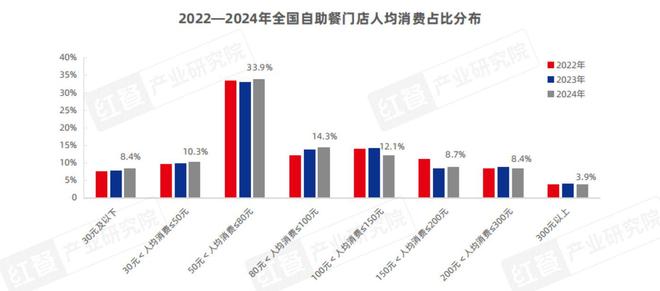 据红餐大数据显示,2022-2024年自助餐的人均消费有下滑趋势。截至2024年,全国自助餐人均消费在80元及以下的门店数占比为52.6%,比2023年提高了1.9个百分点;人均消费在100元及以下的门店数占比为66.9%,比2023年提高了2.4个百分点。