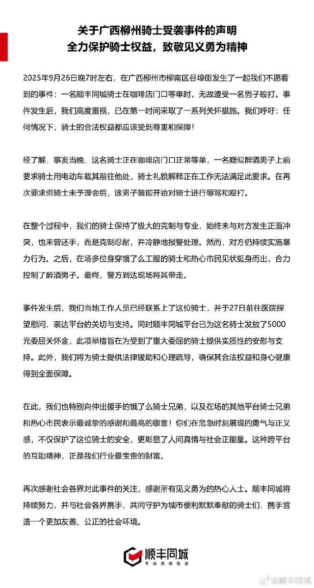 顺丰同城就骑手在等单时遭遇疑似醉酒男子殴打事件作出回应,事件发生时,骑手正在等待订单,突然遭到一名醉酒男子的暴力袭击,公司对此表示强烈关注,已第一时间联系警方处理此事,并全力支持骑手维护自身权益,顺丰同城强调,将坚决打击任何形式的暴力行为,保护骑手的合法权益和人身安全,同时提醒广大骑手注意安全,遇到类似情况及时报警。