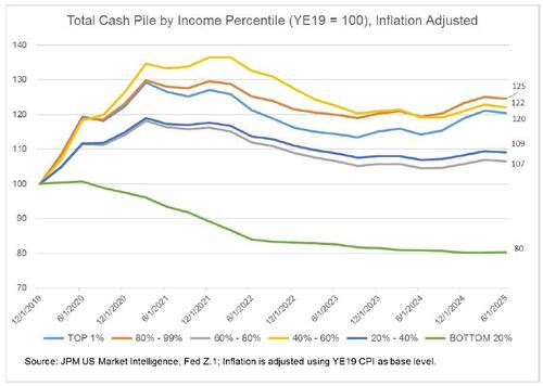 分收入层级看,除最底层的20%人群外,其他所有收入群体经通胀调整后的现金持有量均比2019年高出7%至25%。尤其值得关注的是支票账户余额,从2019年第四季度的1.53万亿美元激增至2025年第二季度的5.42万亿美元,这部分通常被视为用于近期消费的资金。