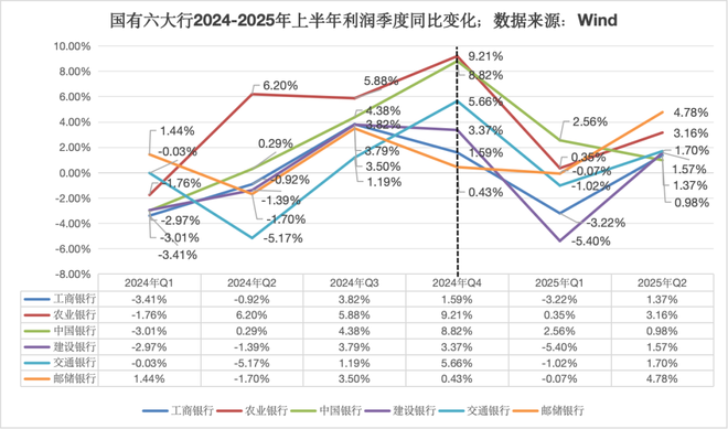 纵向回顾2024年至今国有行各季度同比表现,可以更直观地感受到邮储银行“逆势”向上的韧性——去年四季度至今,其净利增速已跃升为六大行之首。