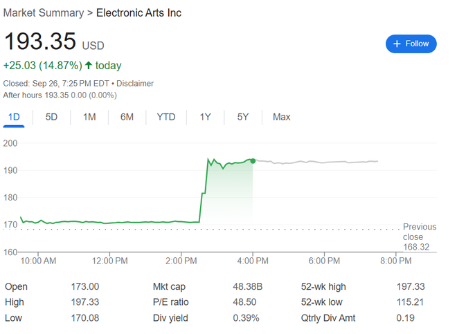 受交易报道推动,EA股价周五收盘大涨近15%至193.35美元的历史新高,推动公司市值升至约480亿美元。