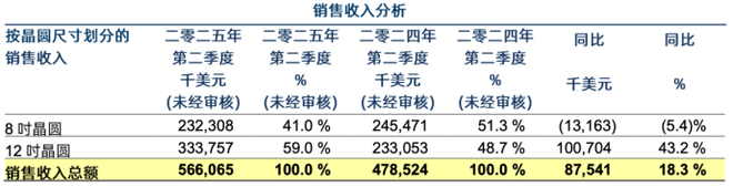 按晶圆尺寸划分,华虹公司主要提供8英寸和12英寸晶圆两大产品。2025年以来,公司传统的8英寸业务收入表现疲软,第一季度与第二季度收入分别为2.311亿美元和2.323亿美元,同比分别下滑3.7%与5.4%。