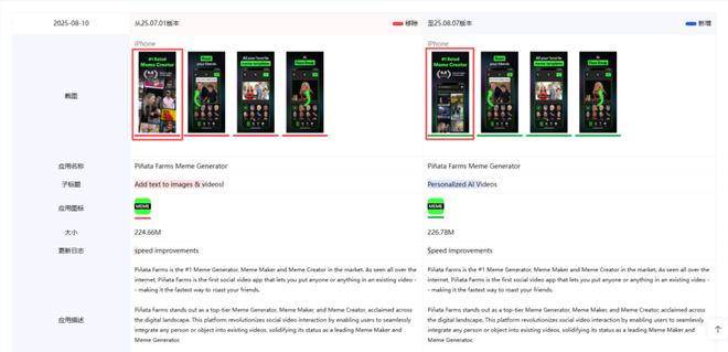 其中8月7日的版本更新尤为重要。除了日常的BUG修复外,本次更新突出了AI对于产品的赋能和改变。子标题的命名由“Add text to images & videos!”变更为“Personalized AI Videos”,直接突出了AI对于视频制作功能的参与。同时对详情页的首图进行变更,突出了AI对搜索功能的优化,进一步提升了AI的权重。