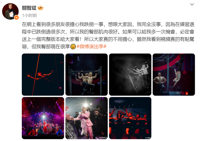 对此,关智斌28日在微博发文回应:“网上看到很多朋友很担心我跌倒一事,想跟大家说,我完全没事,因为在练习过程中已跌倒过很多次,所以我的臀部肌肉很好。”