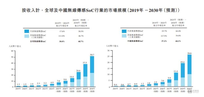 根据弗若斯特沙利文报告,2019年-2024年全球无线传感SoC行业的市场规模正在以30%的增速增长,同时该报告预计全球无线传感SoC行业的市场规模将由2025年的人民币70亿元增长至2030年的人民币507亿元,复合年增长率为48.7%。预计中国无线传感SoC的市场规模将由2025年的人民币25亿元增长至2030年的人民币266亿元,复合年增长率为60.2%。