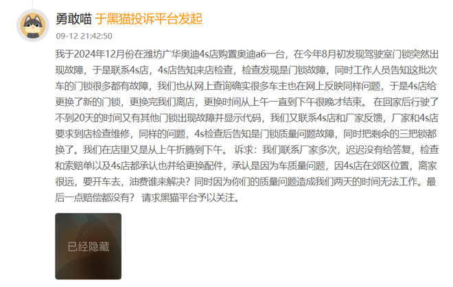 在黑猫投诉上,有车主投诉称,他购买的是2024款奥迪A6L 45 TFSI臻选动感型,没想到频繁出现质量问题。今年8月,驾驶室门锁突然故障;不到20天后,其他门锁出现故障并显示代码,4S店检查后发现同样是门锁问题,并将剩余的三把门锁换了。4S店工作人员表示,这批次的很多门锁都有故障。