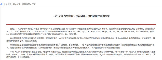 2024年12月,一汽大众召回超13万辆奥迪。召回范围内的部分车辆由于制造原因,长时间使用后,48V皮带启动发电机逆变器的内部电子元件可能与印刷电路板虚接,造成48V启动发电机不再供电。极端情况下,导致电池亏电失去动力,存在安全隐患。