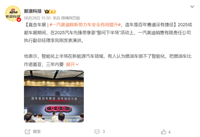 值得一提的是,2025成都车展期间,在2025汽车先锋思享荟"智问下半场"活动上,一汽奥迪执行副总经理李凤刚曾指出,"新势力和传统车企造车各有优势,传统车企造的车安全可靠,劣势是创新不足;新势力造的车更有智能乐趣,但在安全可靠上还有待提升"。