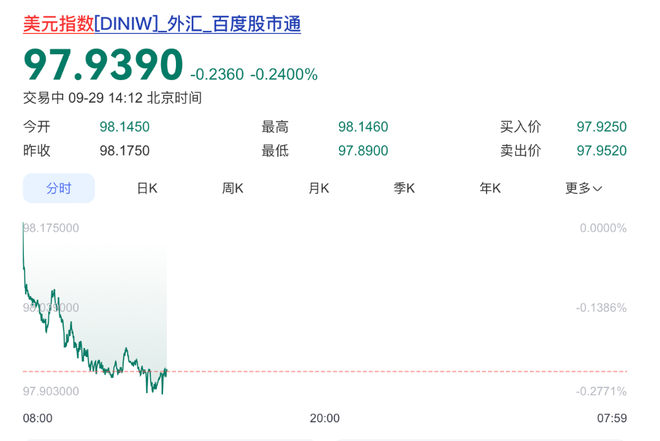 美元指数受美国政府可能关门的影响,下跌近0.26%,报97.94%。政府关门可能导致关键就业数据推迟公布,并给美联储的货币政策路径蒙上阴影”。周一晚些时候,特朗普将与国会民主党和共和党高层领导人讨论延长政府拨款事宜。如果未能达成协议,政府将从周三开始停摆。
