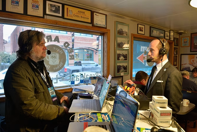 (图为2016年2月,班农(左)在他的播客上采访时任特朗普高级顾问Miller)