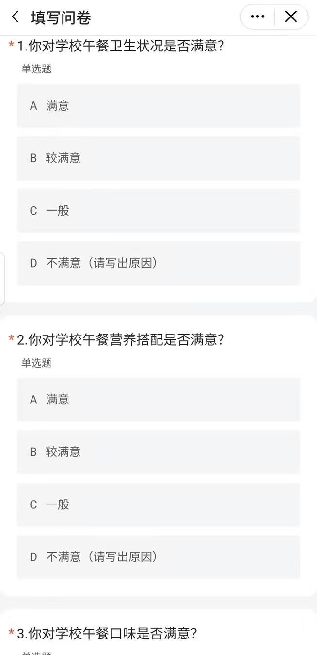 问卷里无非是问 “对午餐卫生状况是否满意”“对营养搭配是否满意” 这类问题,即便是看到了,但我总觉得是走形式,随手就填了 “满意”。