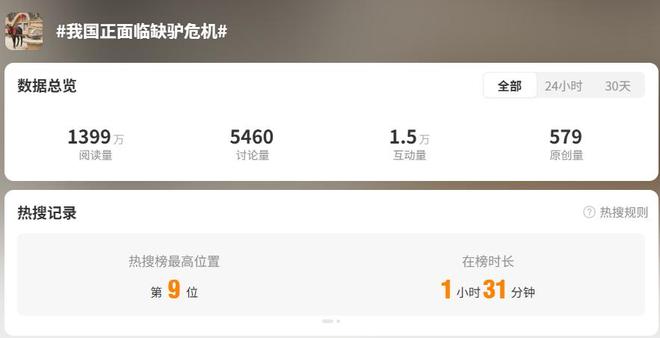 近日,话题"我国正面临缺驴危机"登上微博热搜高位,阅读量快速突破1300万大关。