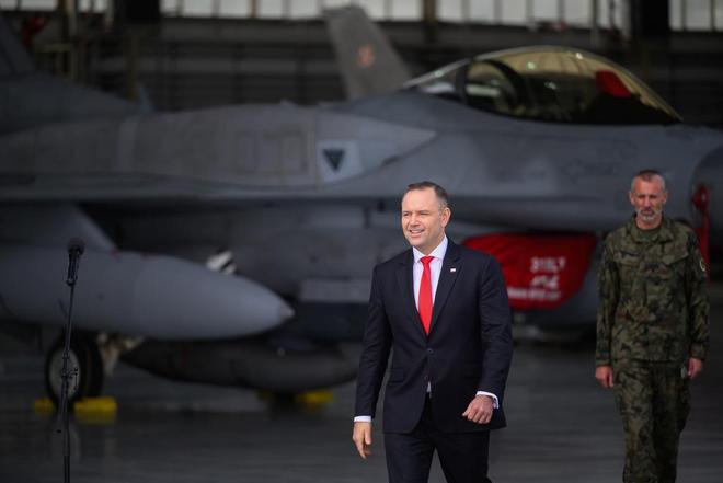 当地时间2025年9月11日,波兰波兹南-克热西尼,波兰总统卡罗尔·纳夫罗茨基在第31战术空军基地会见士兵。总统对克热西尼空军基地的紧急访问与俄罗斯无人机侵犯领空有关。视觉中国 图
