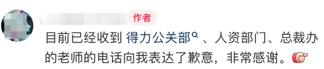 9月30日下午,该网友在社交平台更新了进展:“目前已经收到得力公关部、人资部门、总裁办的老师的电话向我表达了歉意,非常感谢。”
