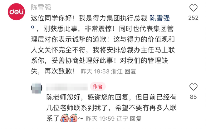 红星资本局注意到,在这篇帖子下方,ID为“陈雪强”的账号留言评论道:“这位同学你好!我是得力集团执行总裁陈雪强,刚获悉此事,非常震惊!同时也代表集团管理层对你表示诚挚的道歉!这与得力的价值观和人文关怀完全不符,我将安排总裁办主任马上联系你,妥善协商处理好此事!对我们的管理缺失,再次致歉!”