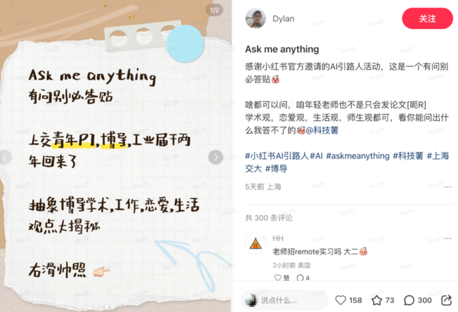 第一阶段:运营基于观察,从过往站内高互动笔记精准汇总出一套 AMA 范式。尤其,在后续“AI 引路人”活动中,多位来自清北人交复、港大等 Top 高校的学者、专家一起发布 AMA 笔记,包括清华大学交叉信息研究院助理教授许华哲,华东师范大学计算机学院研究员、博导林绍辉,清华大学电子系副教授姚权铭等。