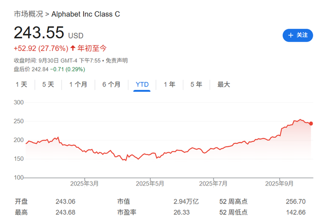 Alphabet的A类股在第三季度飙升38%,这是自2005年以来的最大季度涨幅。这一表现使其年初至今的涨幅超过28%,在备受关注的“科技七巨头”中位居第二,仅次于芯片制造商英伟达。