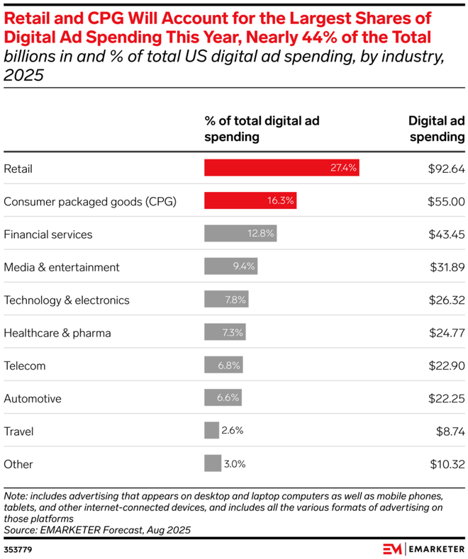 尤其是在社交广告上,零售和快消依然是绝对的第一梯队。根据eMarketer数据,零售+快消,这两个行业合起来贡献了48.4% 的社交广告预算,几乎撑起了整个社交广告市场的半边天。