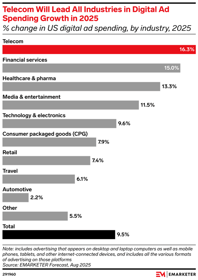 在美国,电信行业从来不是传统意义上的广告大金主。但我注意到,在2025年的美国广告市场,它却成了增长率最高的行业。