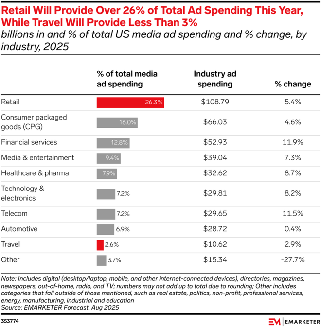 2025年,美国零售行业的广告支出增速已经落在全国平均线之后。