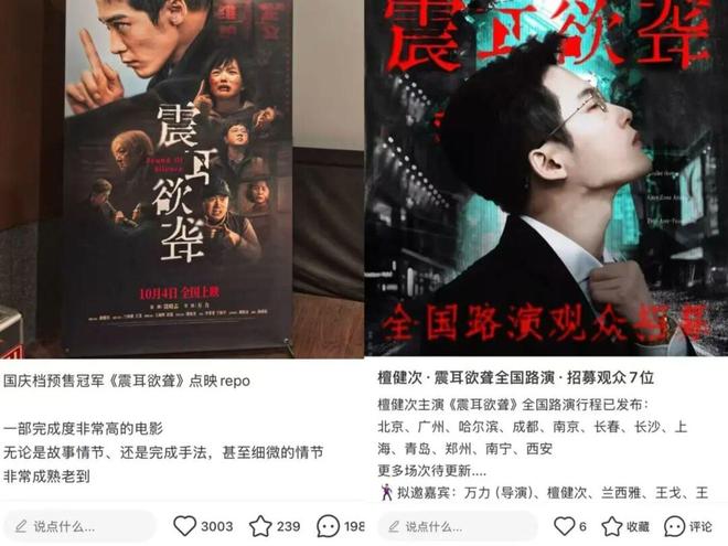 具体来看,预售期表现最强的影片是檀健次主演的反诈题材电影《震耳欲聋》,开启预售不到24小时即突破1000万,截至9月30日14:53,预售票房达3032万,稳居国庆档新片预售榜首位。