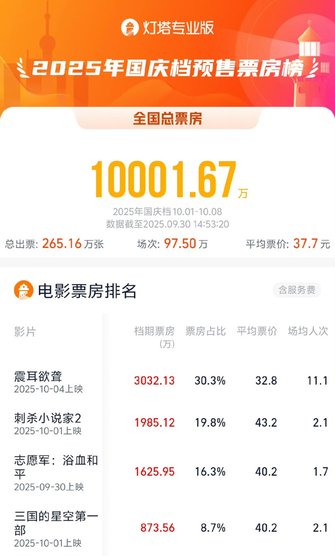 在国庆档正式开启前,排兵布阵、争夺市场份额的暗战已经开始。9月23日9时,2025国庆档预售正式开启,截至发稿前,国庆档实时预售票房已突破1亿,其中《震耳欲聋》《刺杀小说家2》《志愿军:浴血和平》分列前三位,与去年同期相比,依然缺少爆发力。