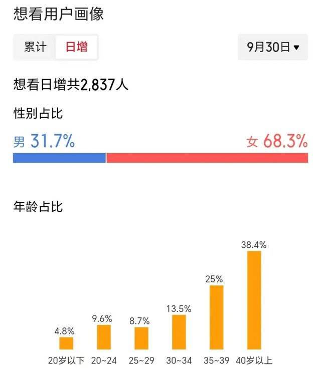 票务平台显示,《志愿军3》的想看用户画像中,其40岁以上年龄层占比最高。同样受这一年龄段观众喜欢的还有《三国的星空第一部》,其中女性占比逼近70%。